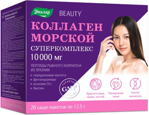 - Специально для красоты российских женщин компания Эвалар разработала инновационную beauty-новинку - Коллаген морской Суперкомплекс - из высококачественного японского и французского сырья с максимальной дозировкой2 гидролизованного рыбного коллагена - 10 000 мг!