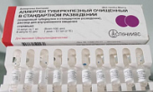 Очищенный туберкулин в стандартном разведении представляет собой фильтрат смеси убитых нагреванием культур микобактерий туберкулеза человеческого и бычьего видов, очищенный путем ультрафильтрации, осажденный трихлоруксусной кислотой, обработанный этиловым спиртом и эфиром для наркоза, растворенный в стабилизирующем растворителе.