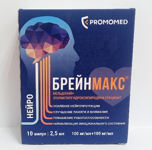 Совместное применение мельдония и этилметилгидроксипиридина сукцината приводит к синергическому фармакодинамическому взаимодействию двух компонентов, что повышает нейропротекторную активность препарата. При применении комбинированного лекарственного препарата БРЕЙНМАКС® оказываемый противогипоксический, антиоксидантный, ноотропный и противоишемический эффект двух действующих веществ превосходит фармакологический эффект каждого из компонентов, применяемых в отдельности, что приводит к уменьшению клинических проявлений цереброваскулярной недостаточности, улучшению когнитивных функций, улучшению памяти и внимания, нормализации эмоционального состояния, уменьшению симптомов психического и физического перенапряжения, повышению работоспособности, увеличению толерантности к умственным и физическим нагрузкам.